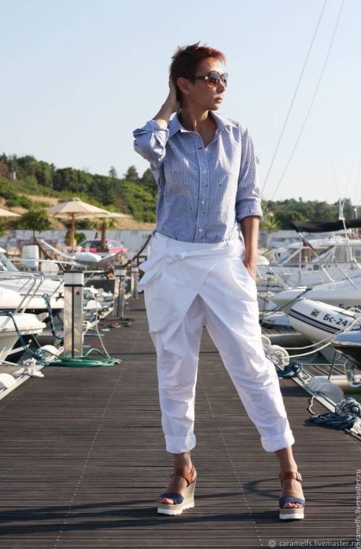 Белоснежная рубаха с брюками для красивых женщин.