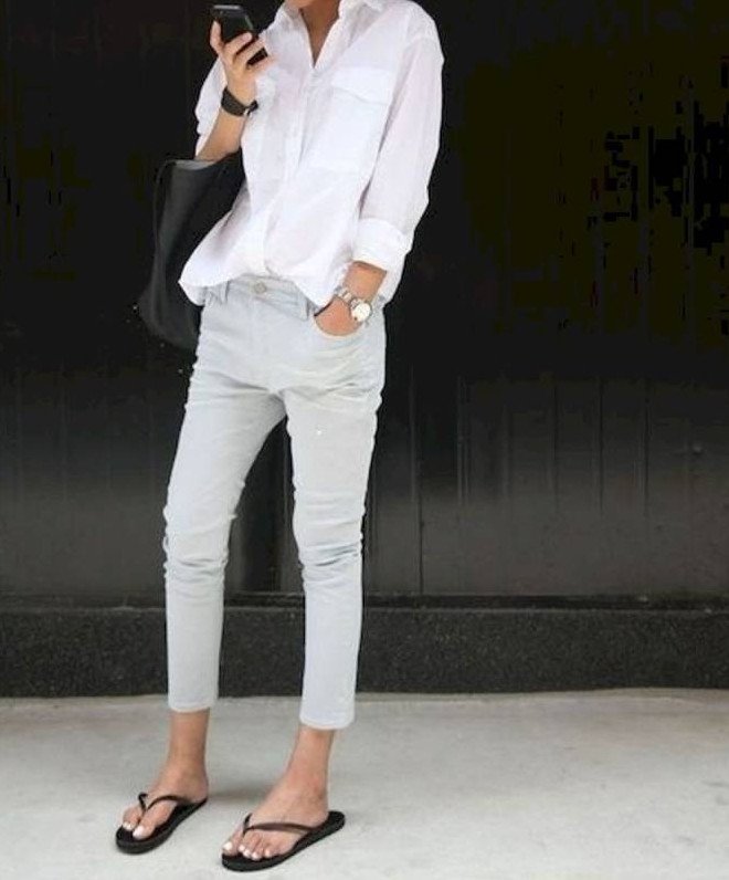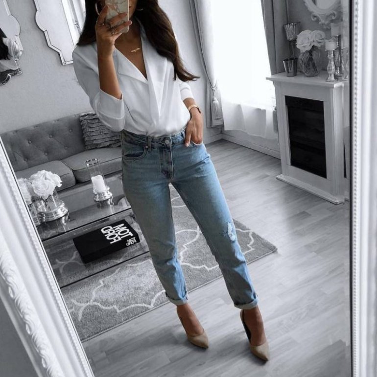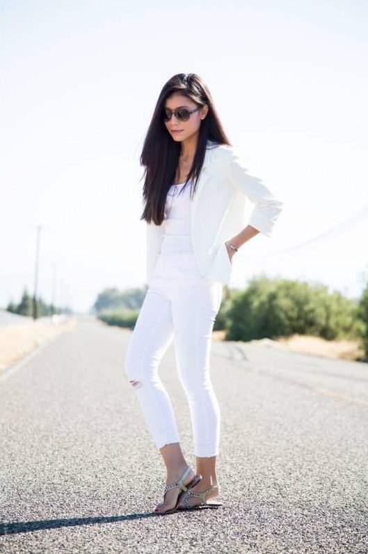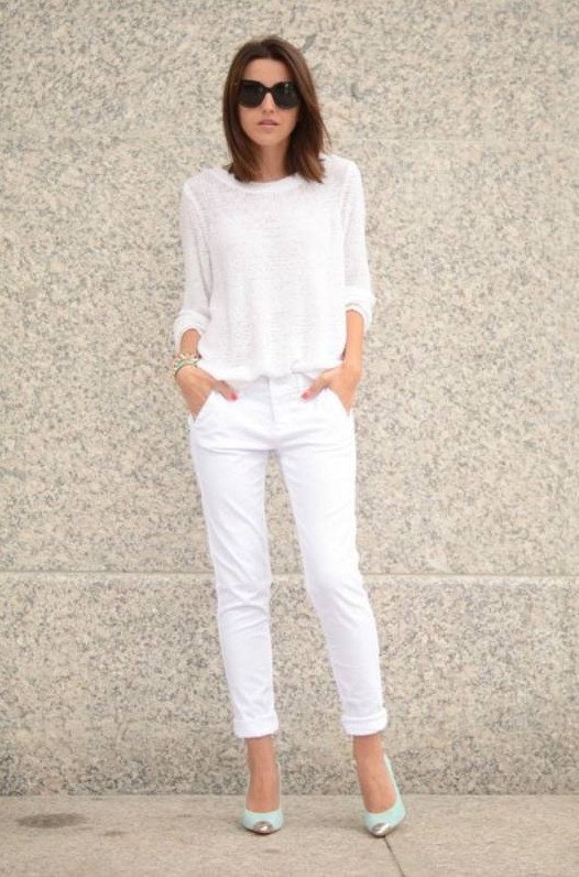 Белоснежные джинсы с белоснежной блузкой.