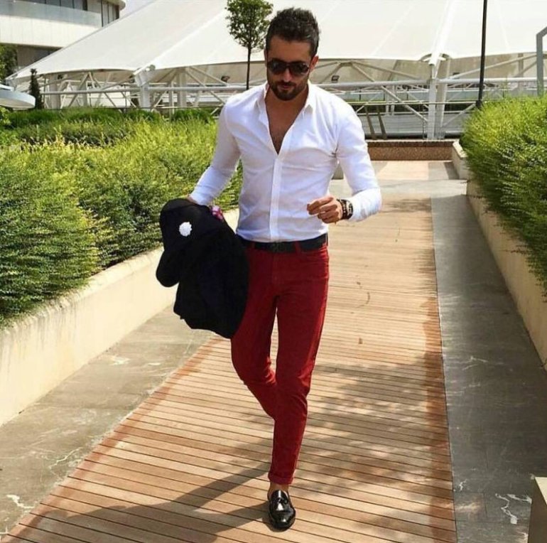 Очень красные штаны с белоснежной рубахой.