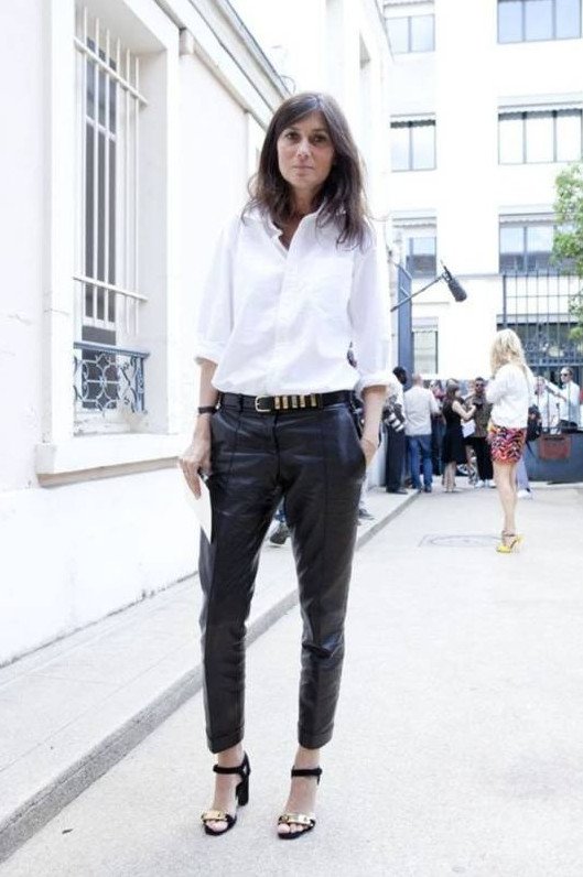Кожаные штаны с белоснежной рубахой.