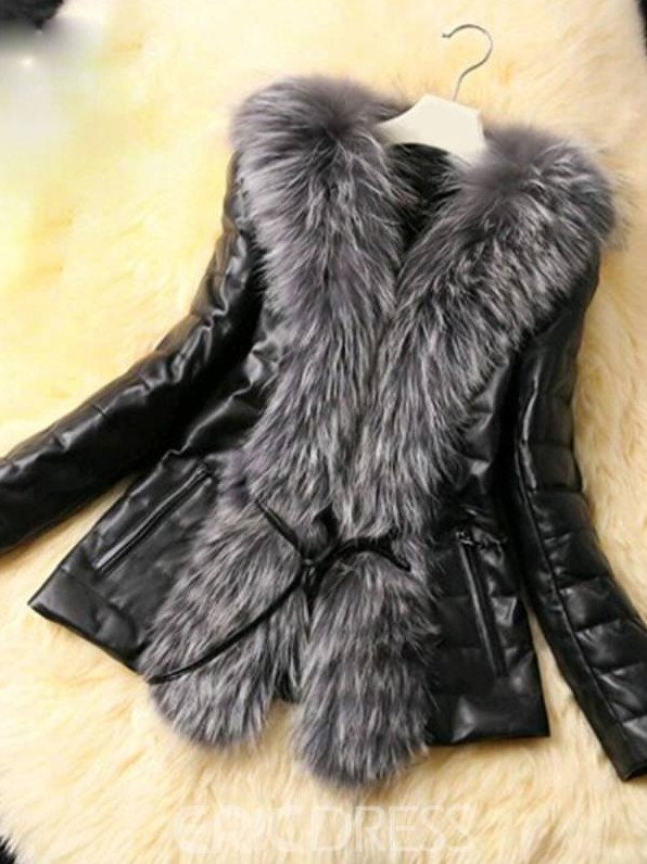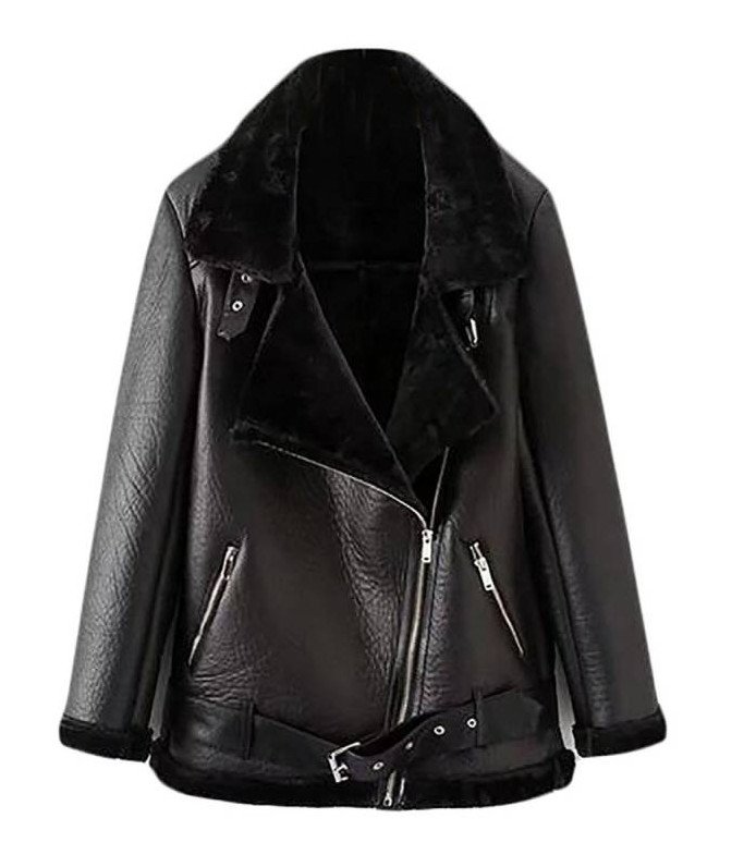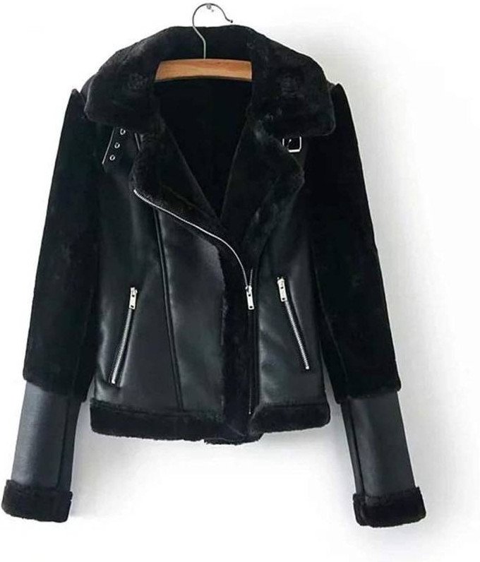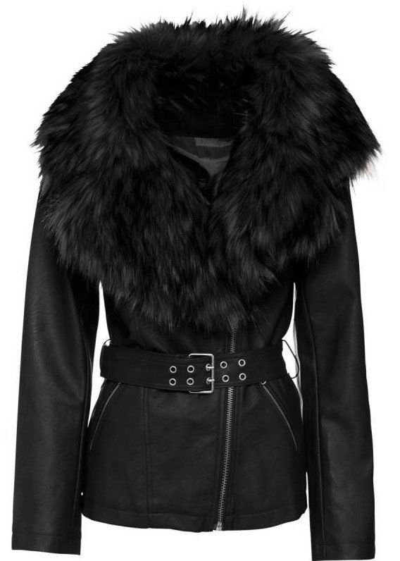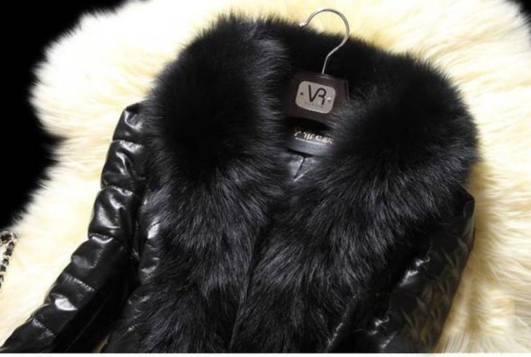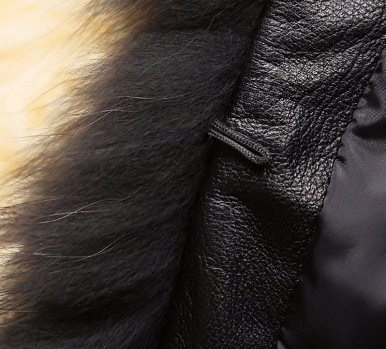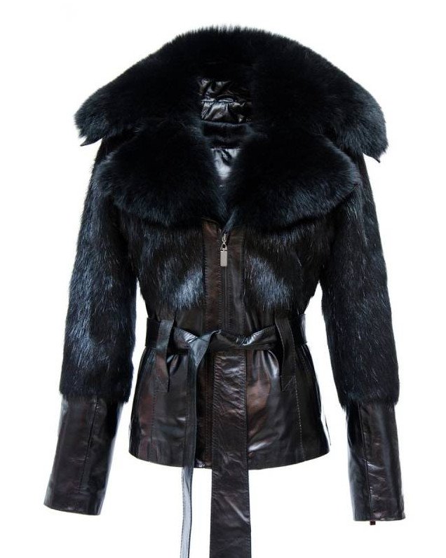 Темная кожаная куртка с мехом.