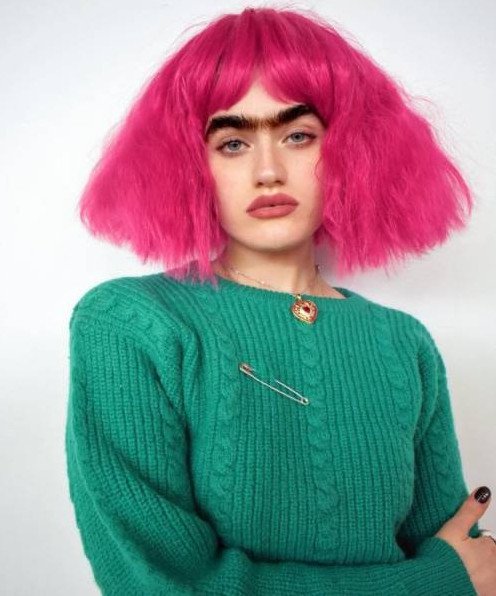 Розовые волосы и брови.