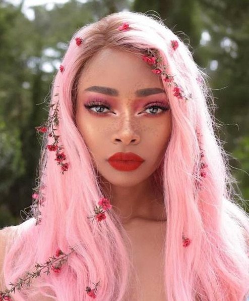 Розовый мейкап с розовыми волосами.