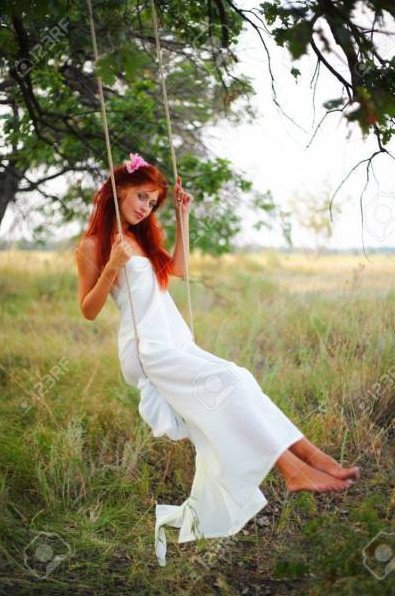 Рыжеватая модель на качелях.