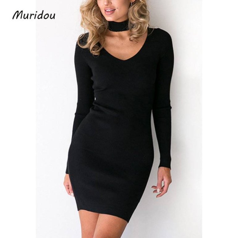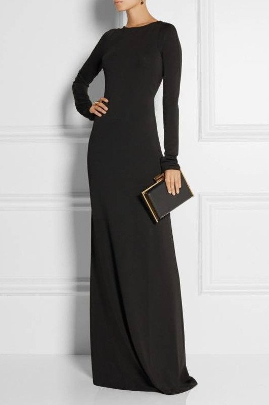 Темное облегающее платье с длинноватым рукавом.