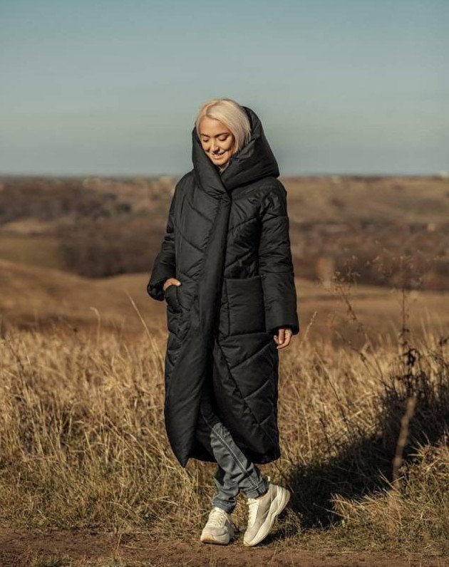 Чёрный пуховик дамский длиннющий оверсайз.