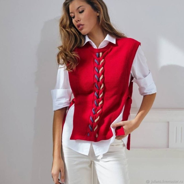 Белоснежная рубаха с вязаной жилеткой.
