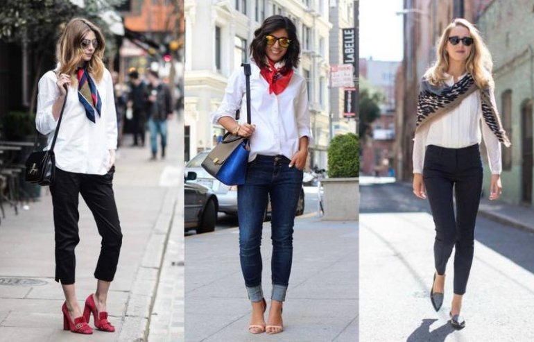 Луки с броским платком и черным костюмчиком.