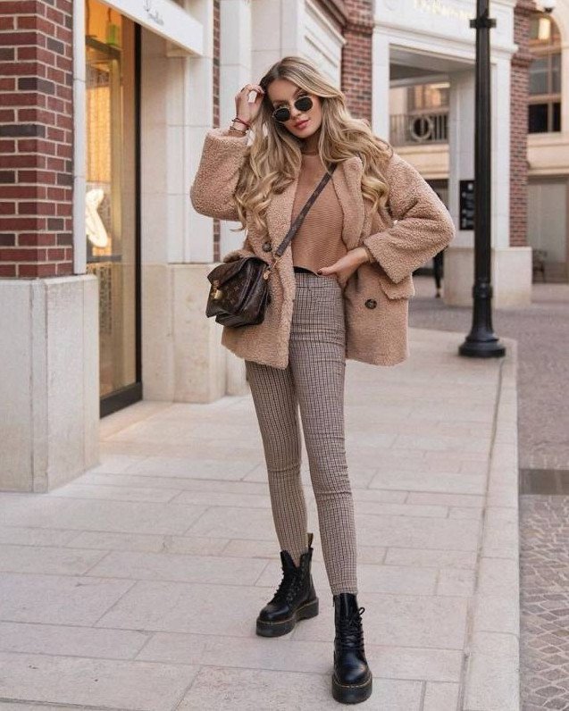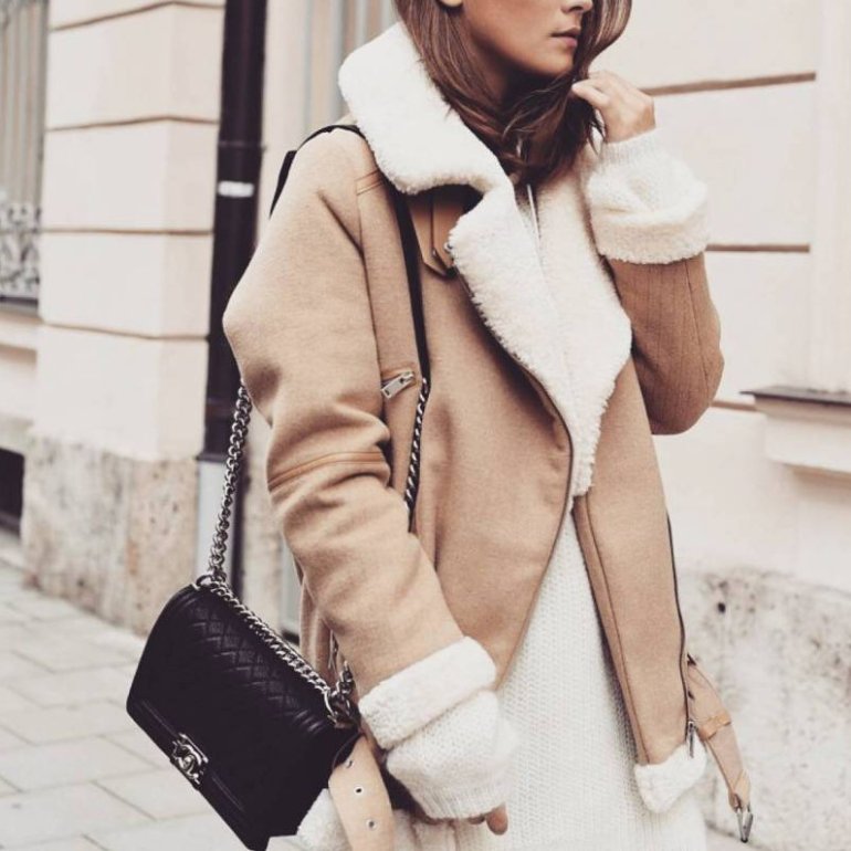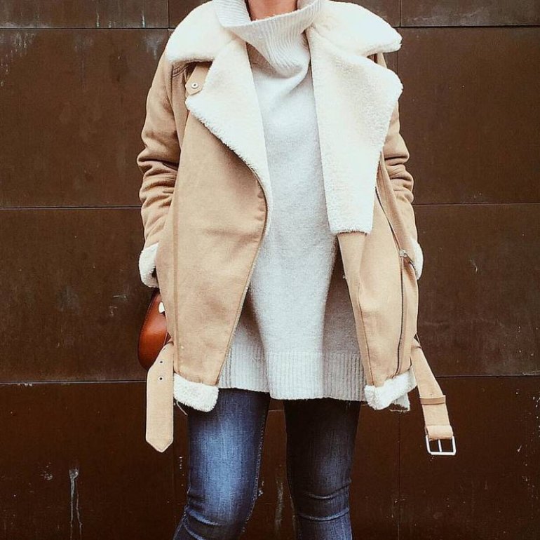 Лук с бежевой дубленкой.
