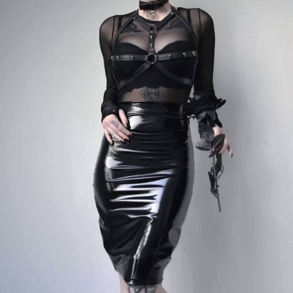 Кожаная юбка и перчатки.