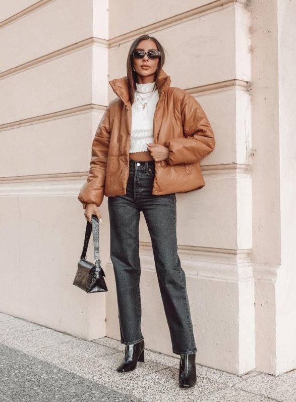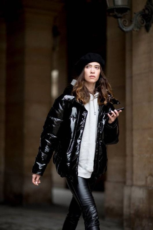 Темный пуховик стрит стайл 2021.