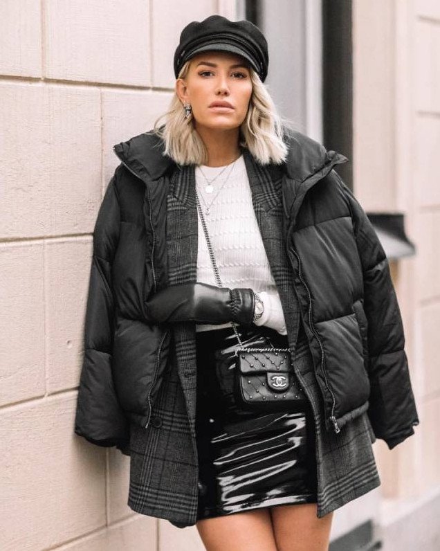 Кожаная юбка с пуховиком.
