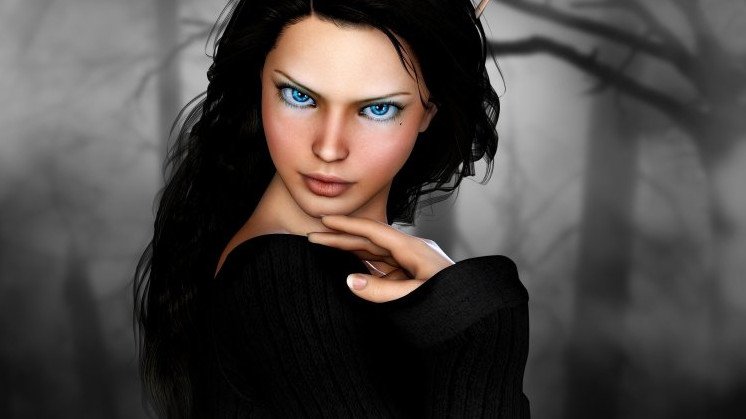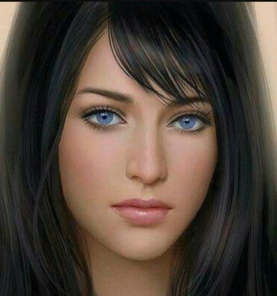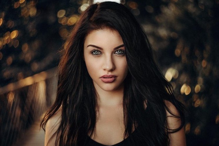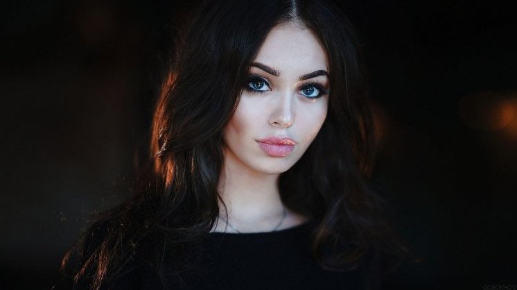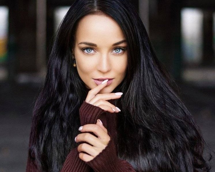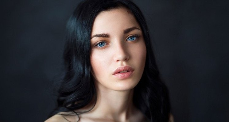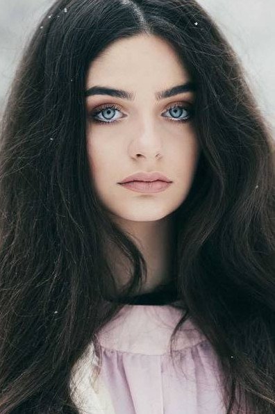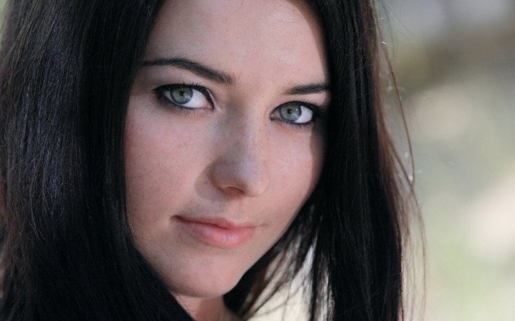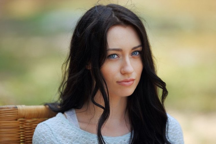 Черноволосая девушка с голубыми глазами.