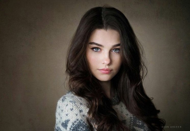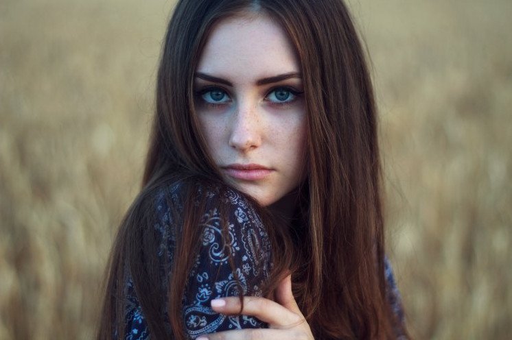 Шатенка с голубыми глазами.
