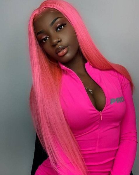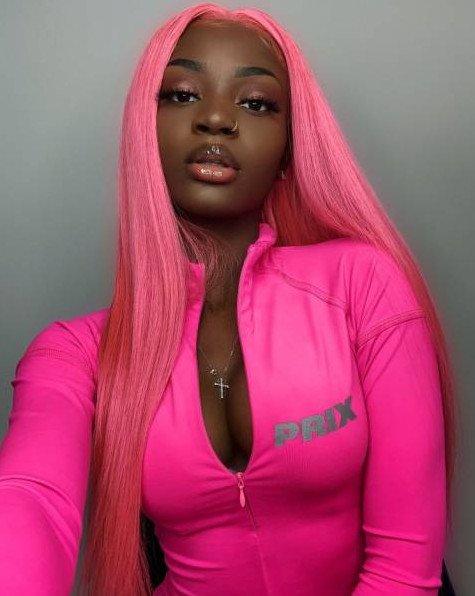 Темнокожая девушка с розовыми волосами.
