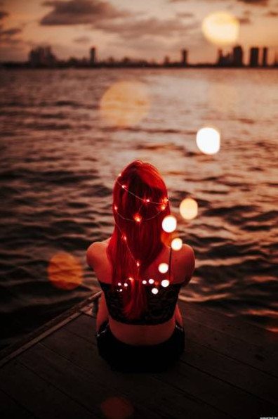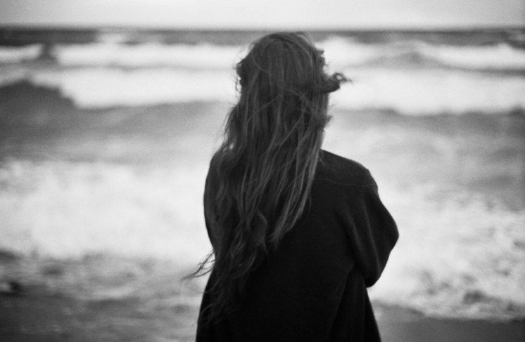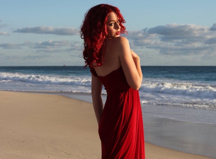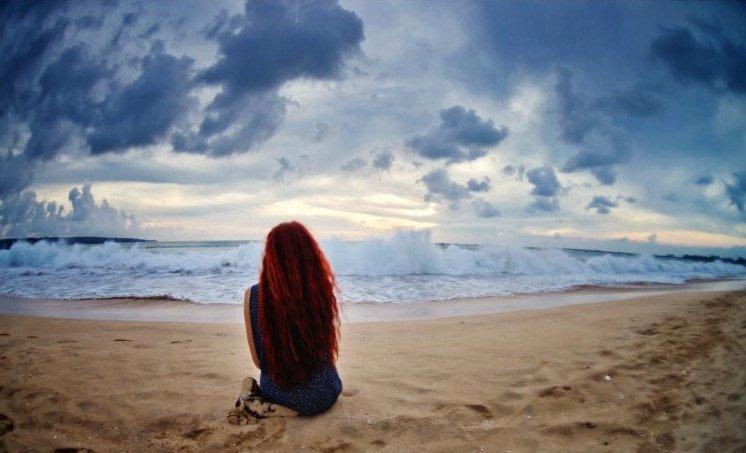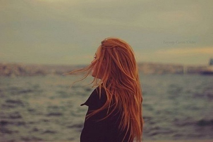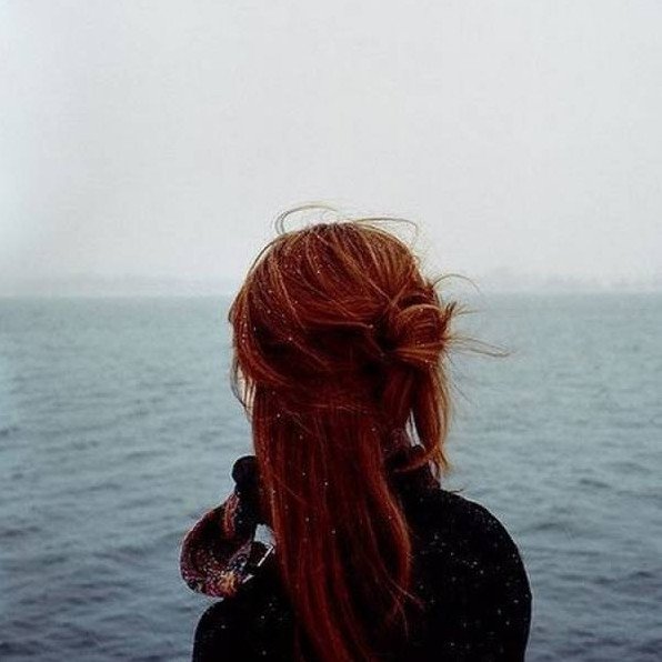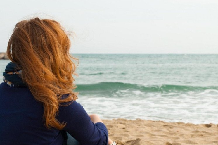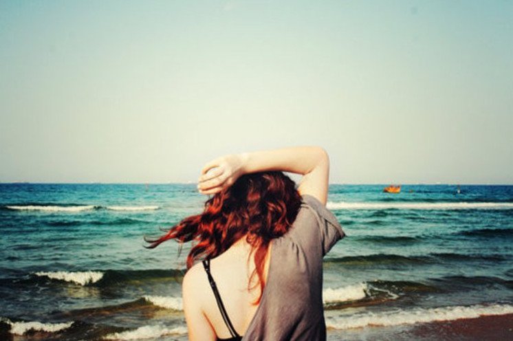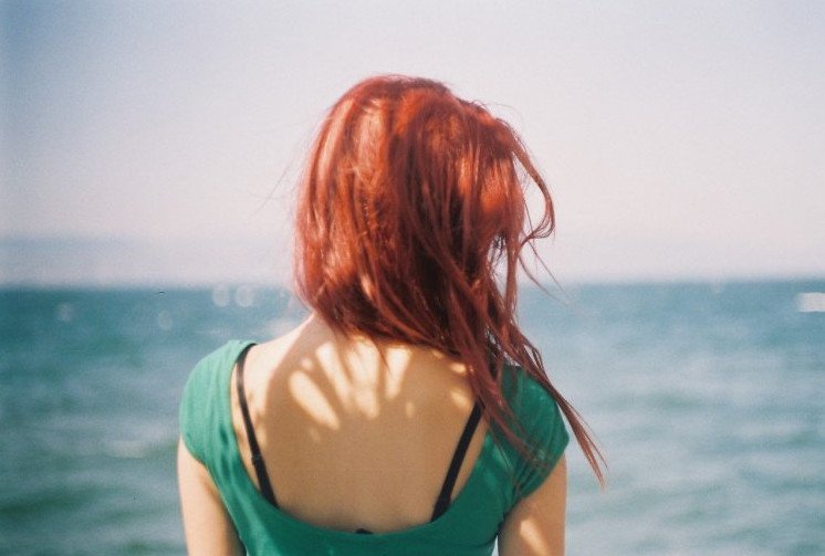 Девушка с рыжеватыми волосами со спины на море.