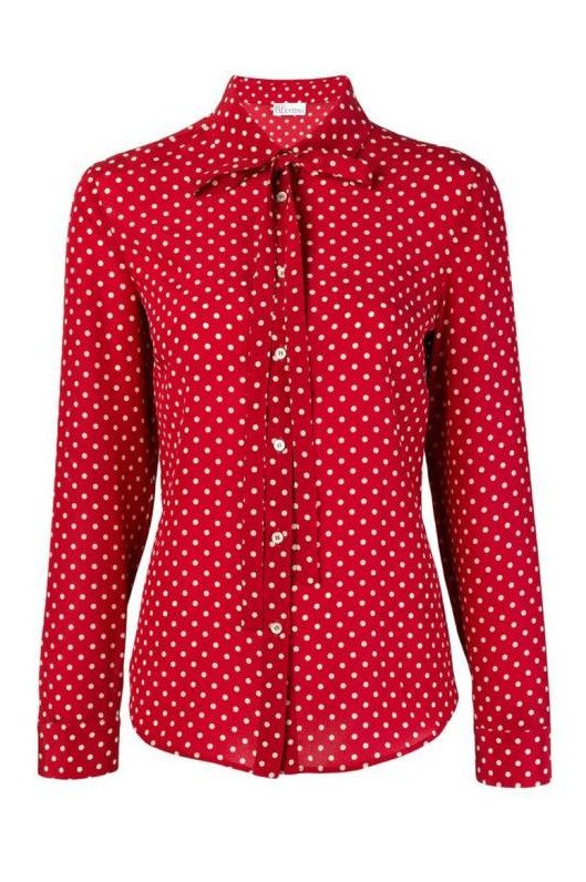 Очень красная блузка в горошек.