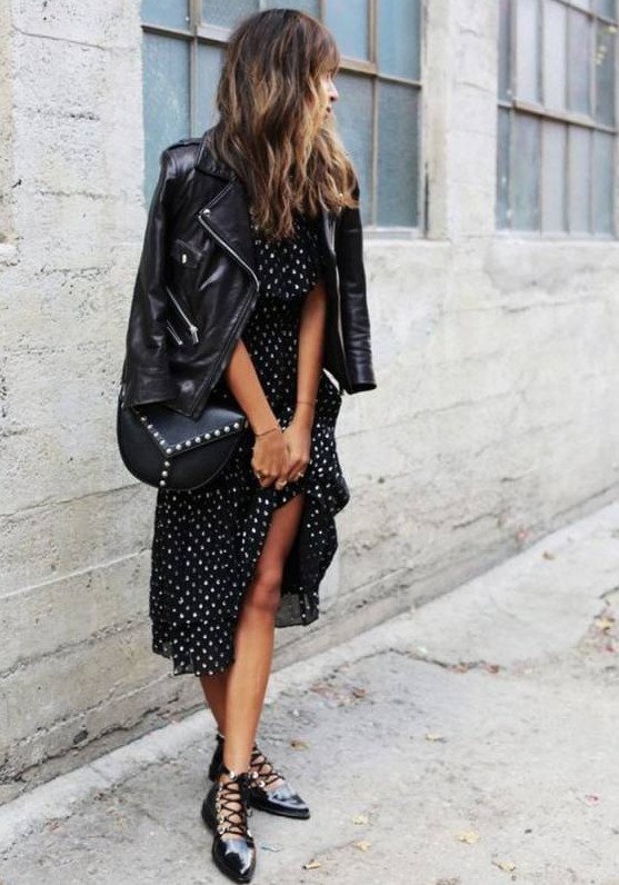 Темное платье с кожаной курткой.