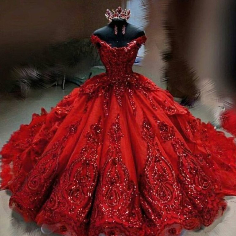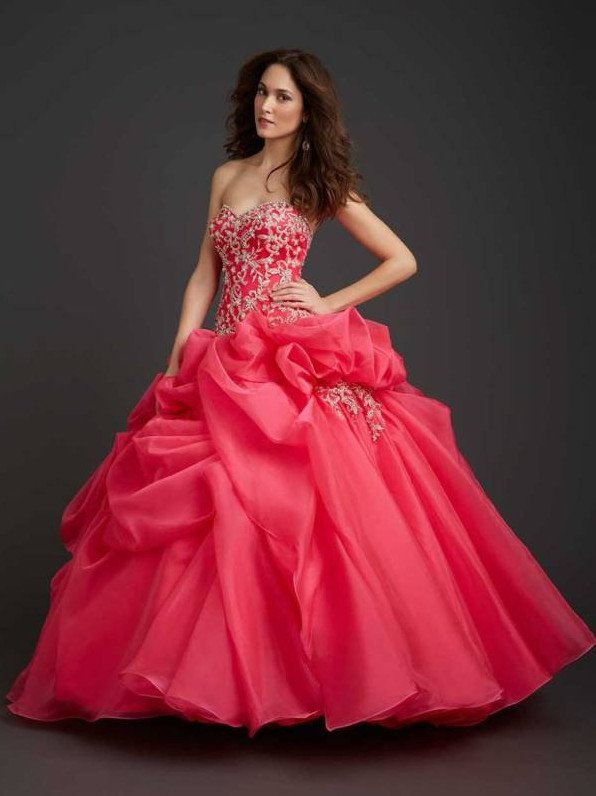 Красноватое бальное платье пышноватое.