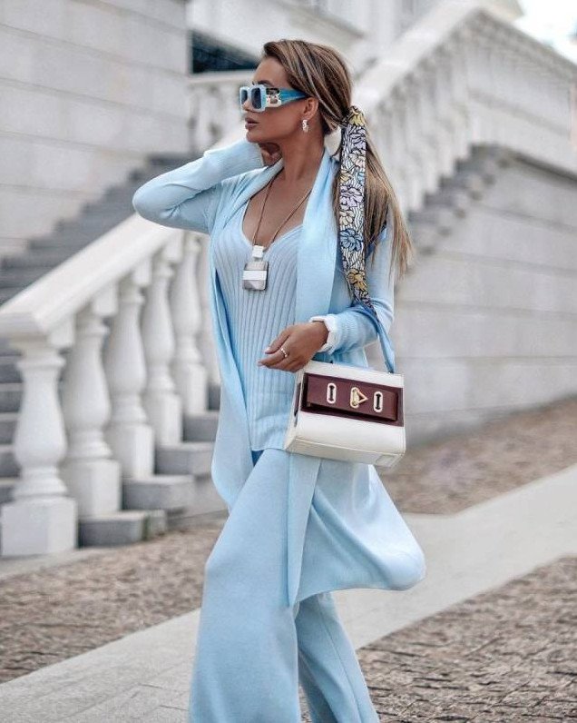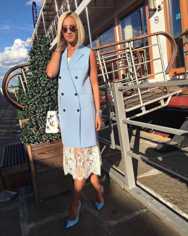 Голубое платье с голубой жилеткой.