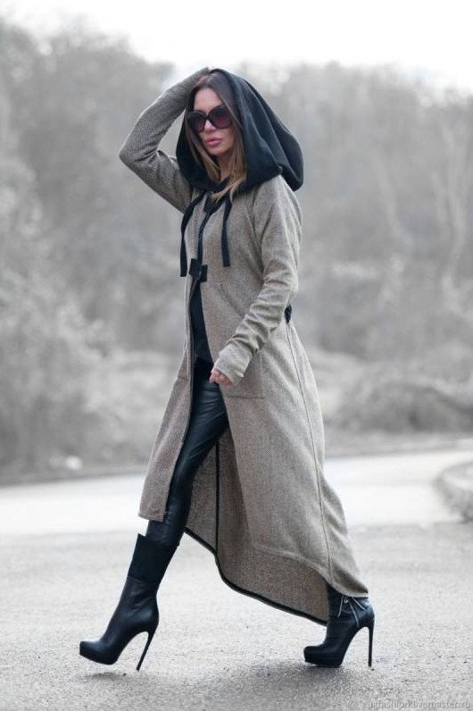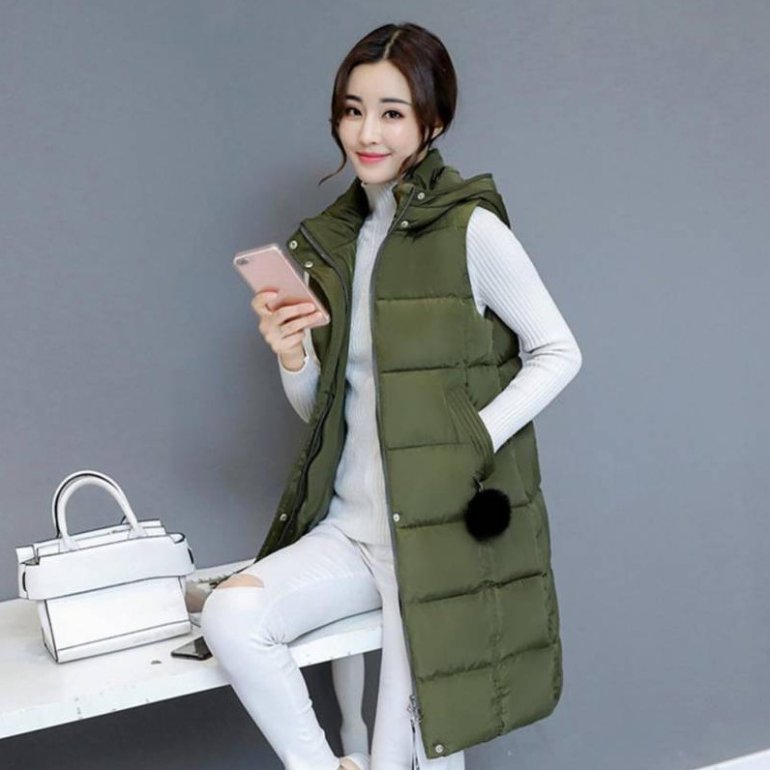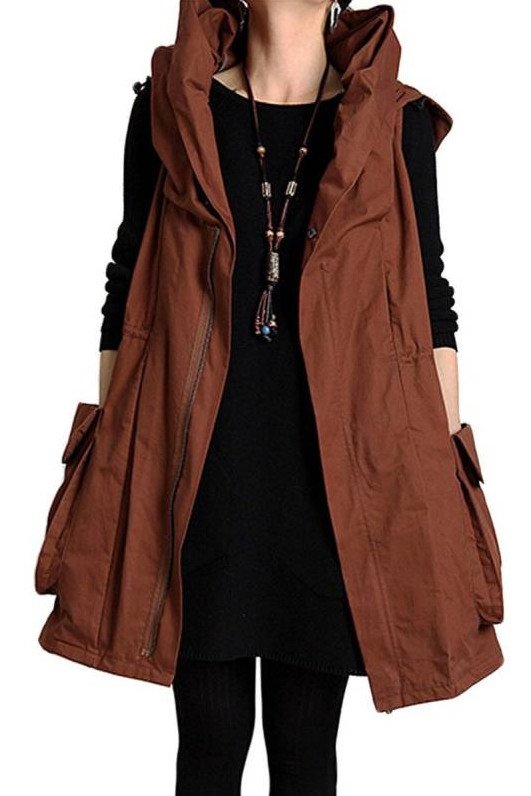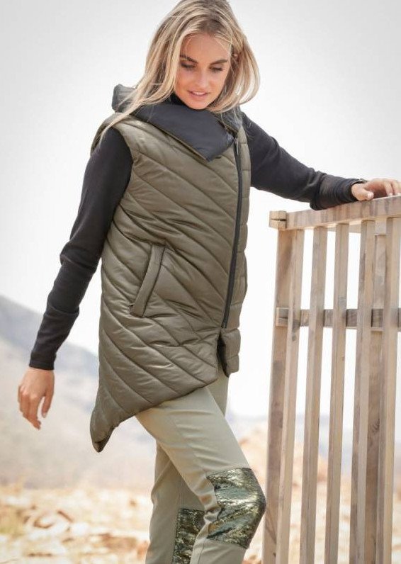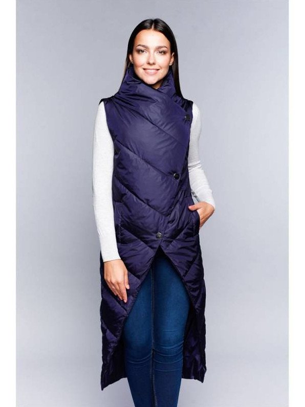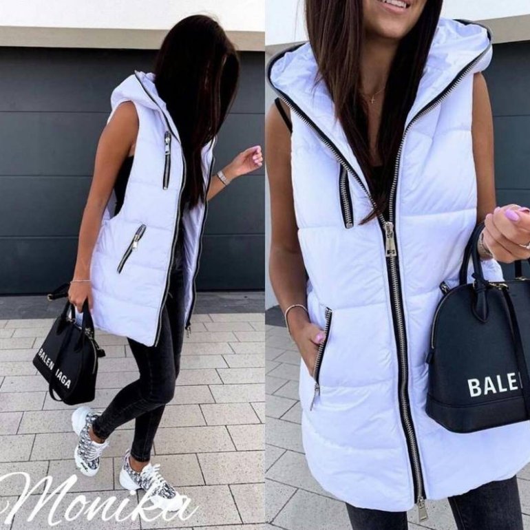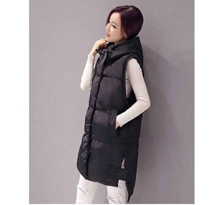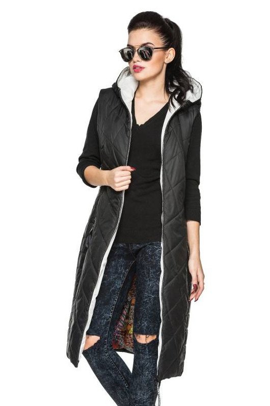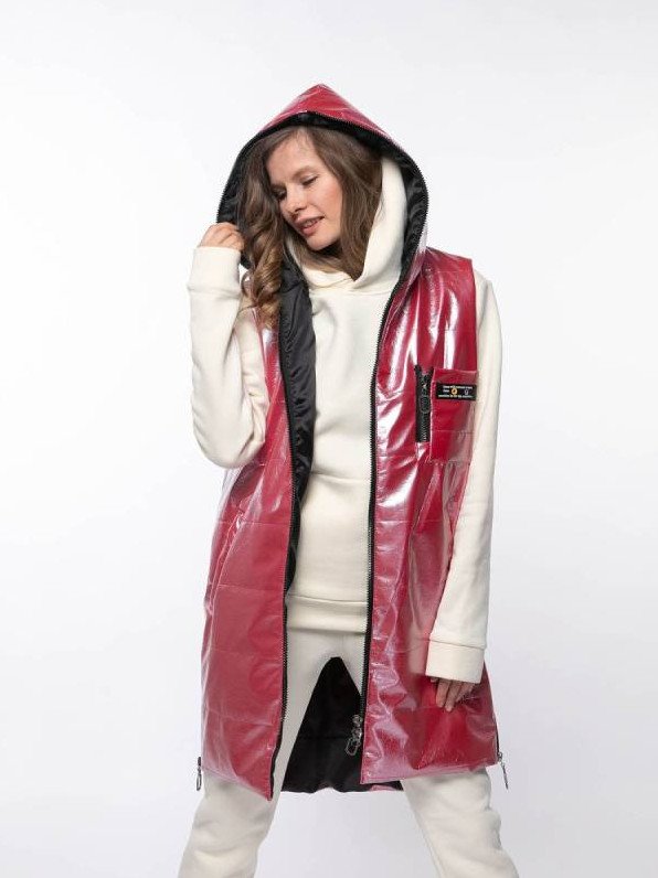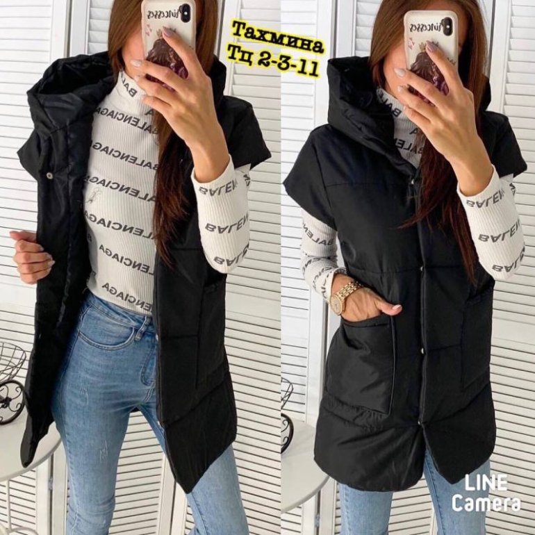 Двусторонний жилет длиннющий с капюшоном дамский.