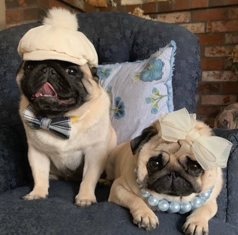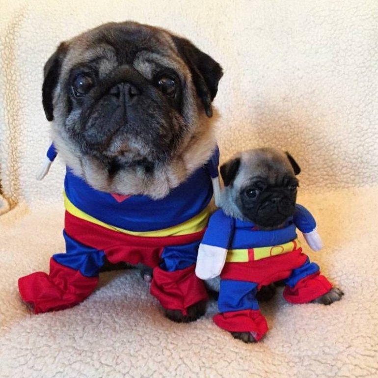 Милые мопсы в костюмах.