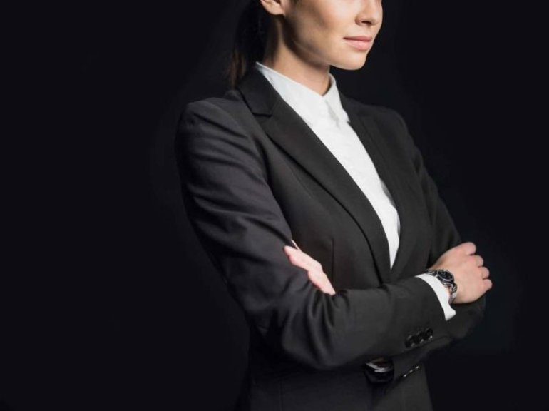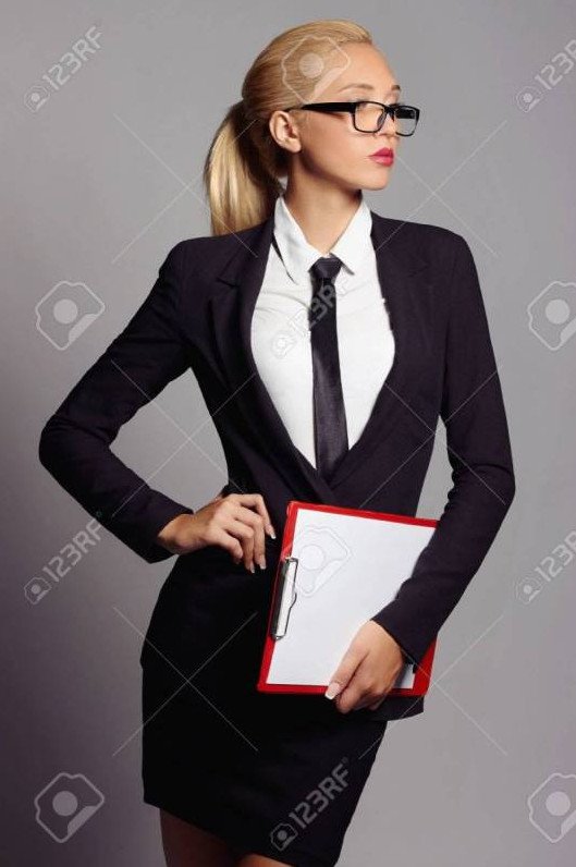 Девушка красавица в серьезном костюмчике.