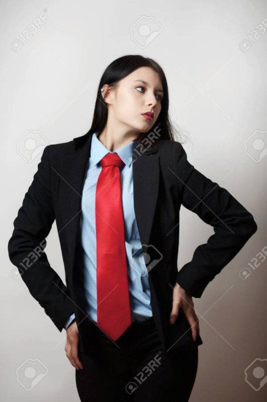 Красивая женщина в костюмчике с галстуком.