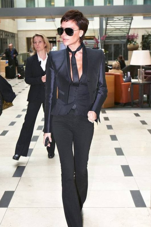 Виктория Бекхэм в черном костюмчике.