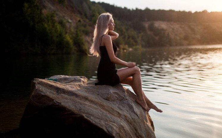 Красивая девушка посиживает на берегу реки.