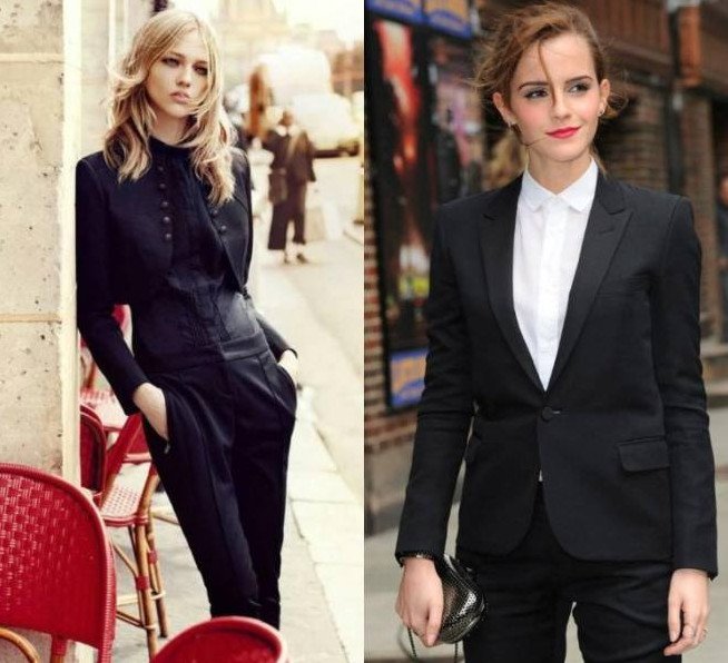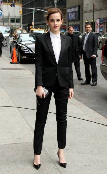 Эмма Уотсон в черном брючном костюме.