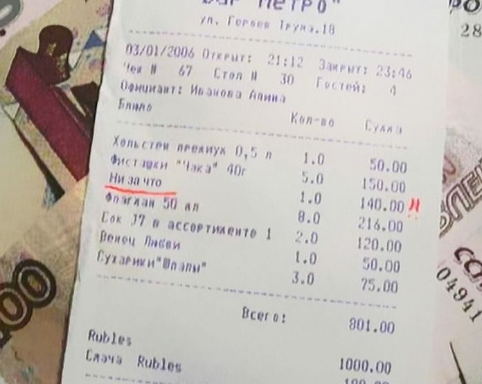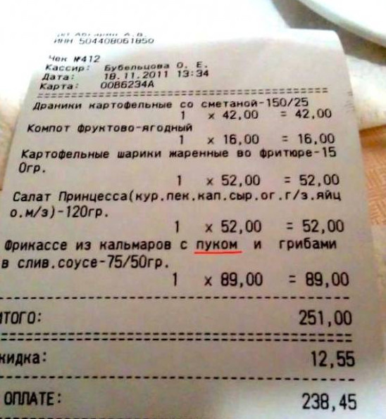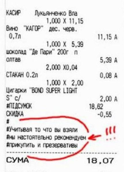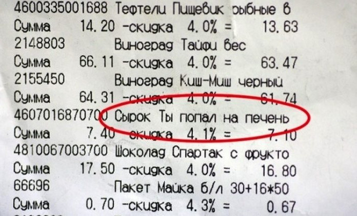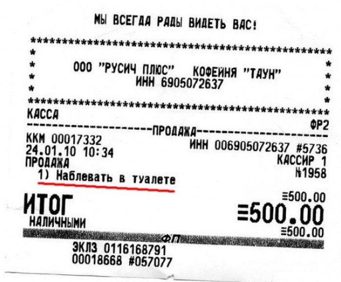 Смешно - Творческий потенциал чеков: не попросту бумажка, а источник вдохновения Приколы 19-11-2023, 14:26 119 Периодически чек — не попросту кассовая бумажка, но настоящее непаханное поле для креатива!