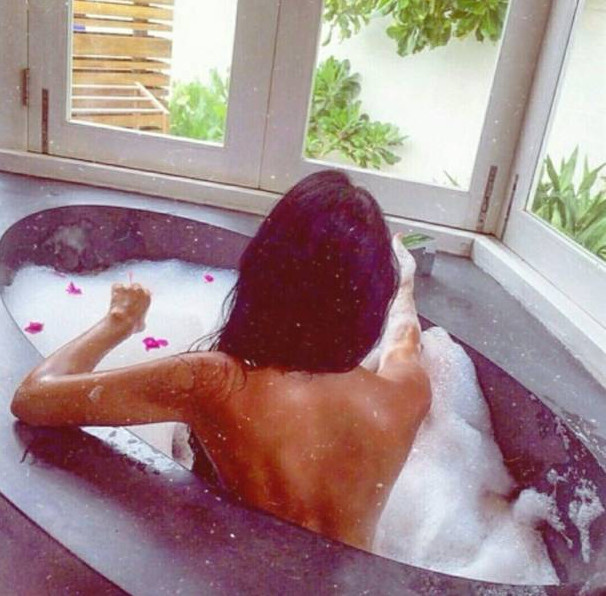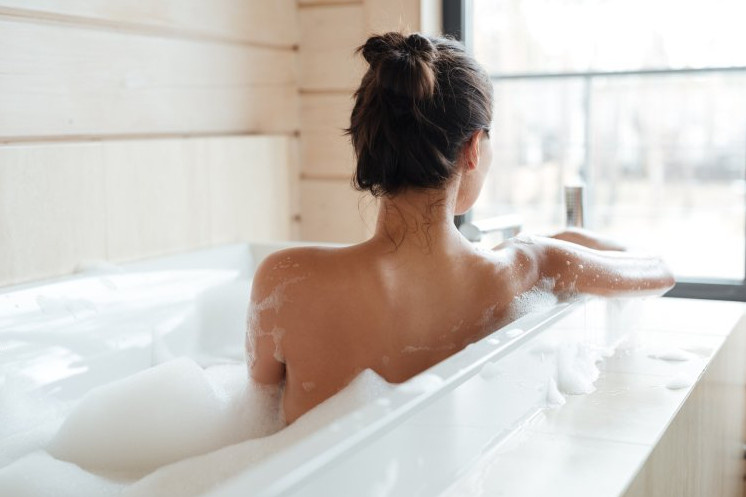 Симпатичная девушка в ванне со спины.