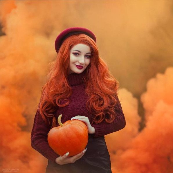 Рыжеватая симпатичная девушка красавица в оранжевом.