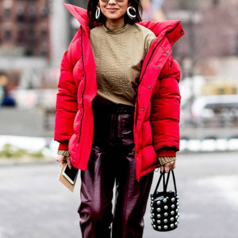Очень красный пуховик оверсайз.