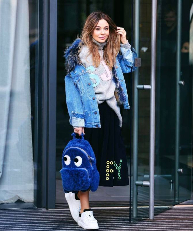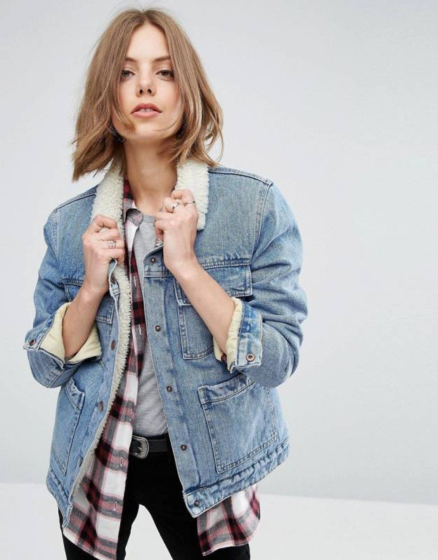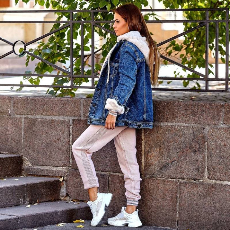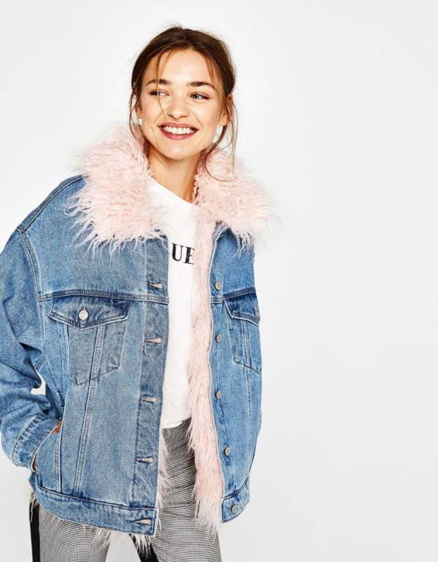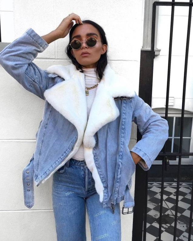 Образ с джинсовой курткой с мехом.
