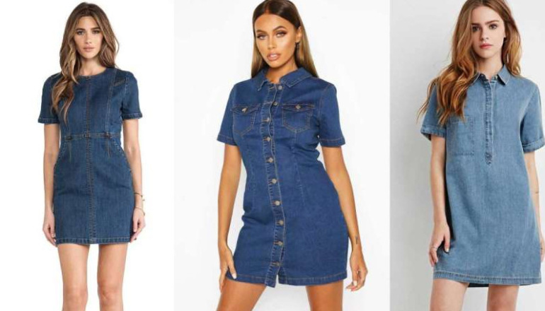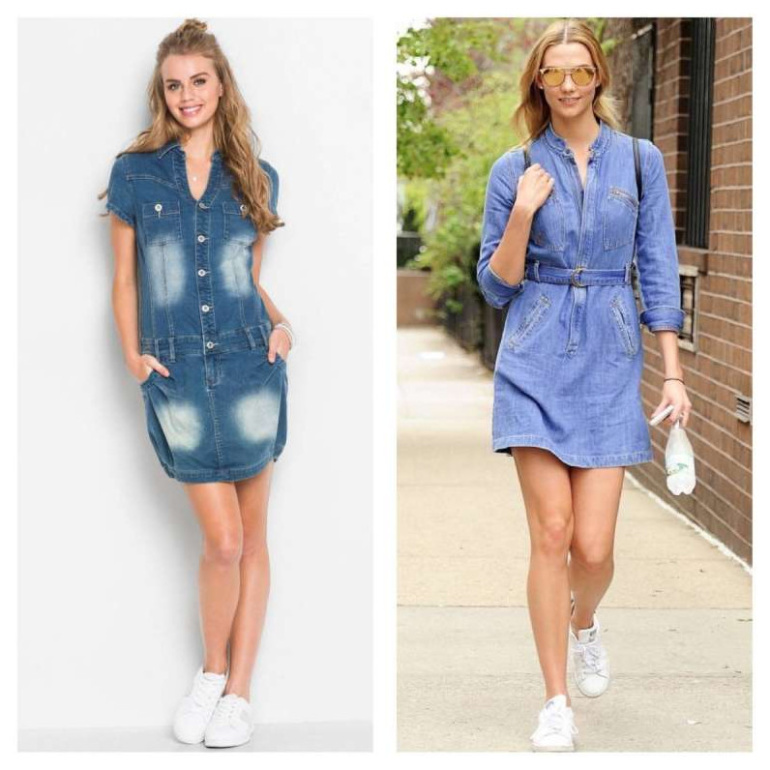 Девушки в джинсовых платьях на пуговицах.