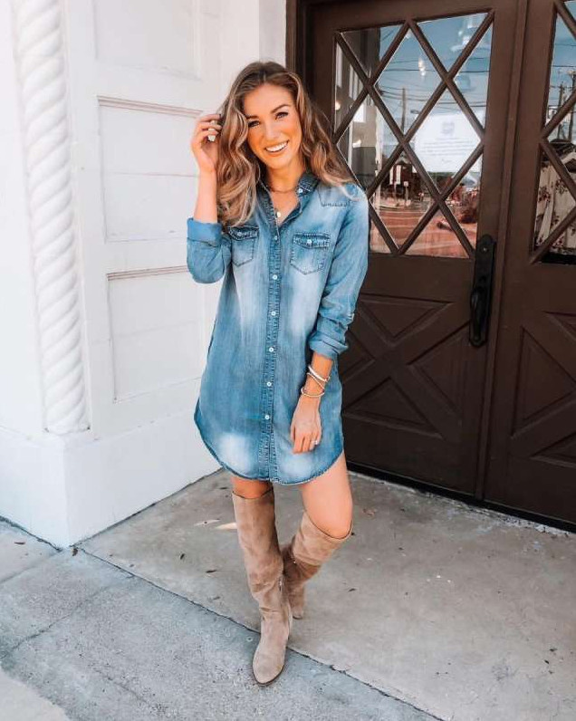 Джинсовое платье рубаха с сапогами.