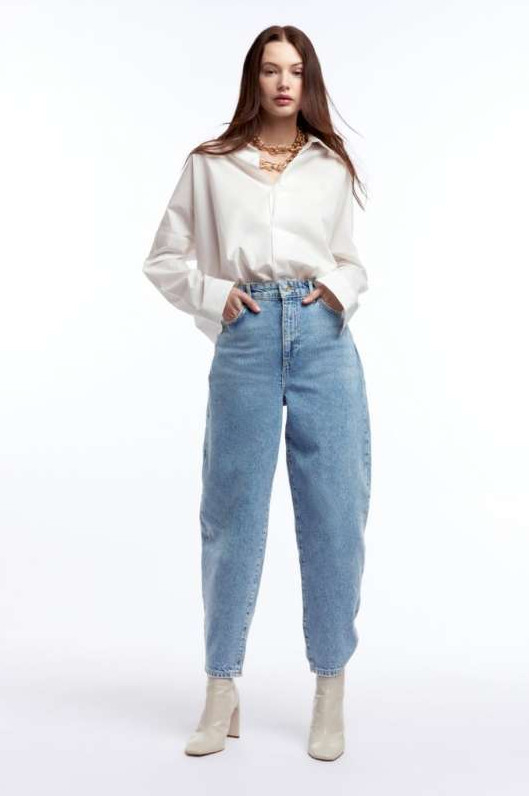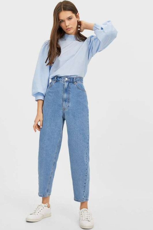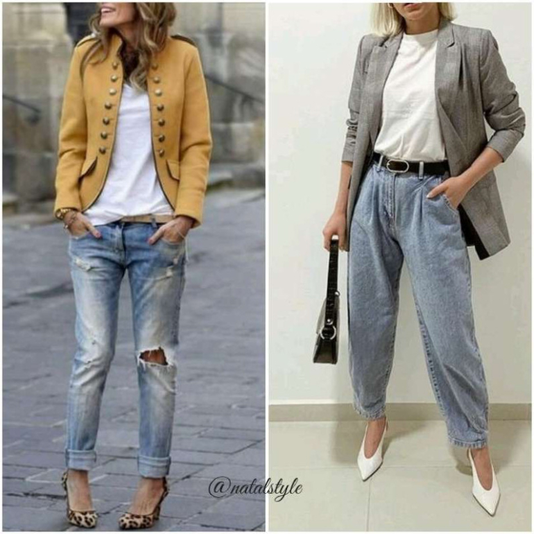 Джинсы бананы с блузкой.