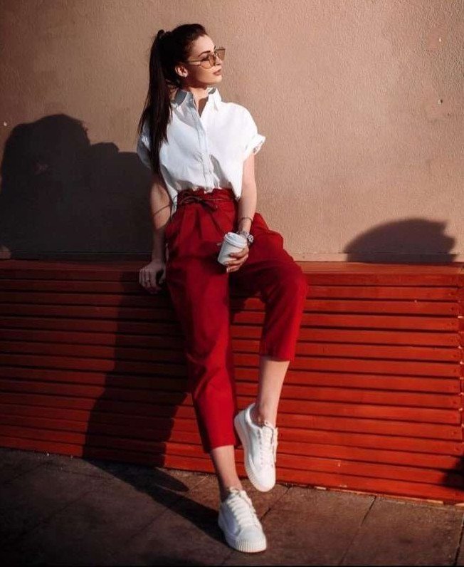 Девушка красавица в красных брюках.