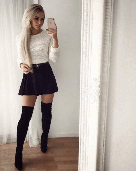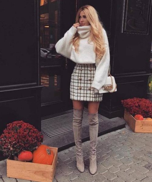 Белый свитер с юбкой.