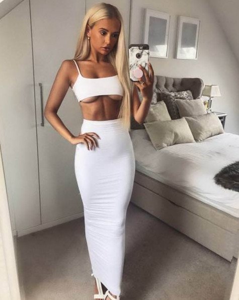 Симпатичная девушка красавица в белом обтягивающем платье.