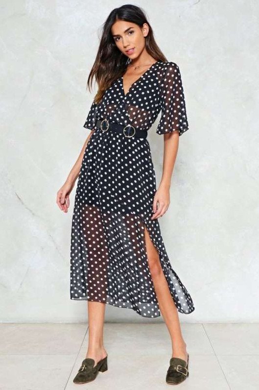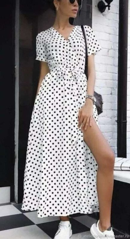 Длинноватое платье в горошек.