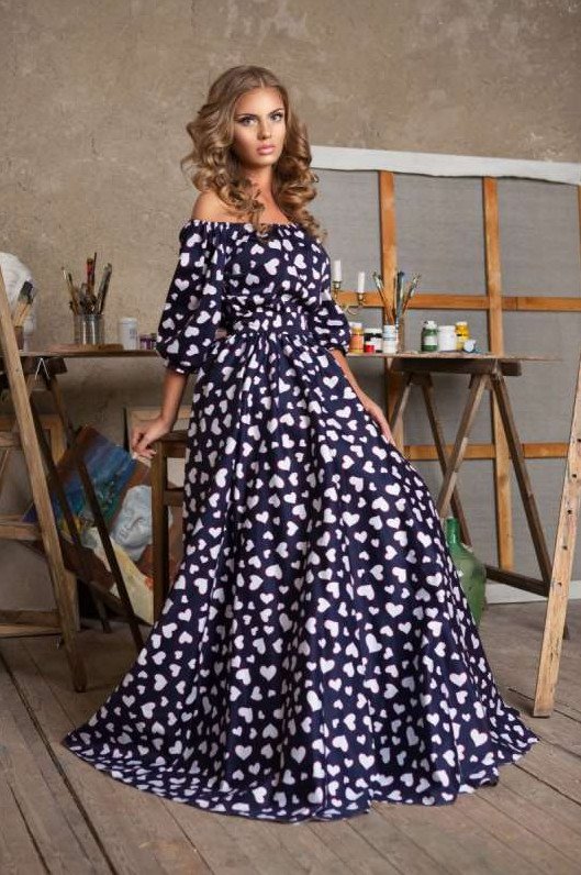 Штапельное платье макси горох на синем.
