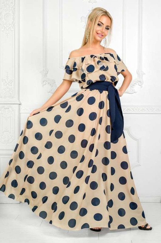 Бежевое платье в горошек.