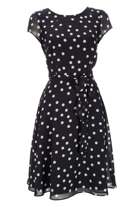 Темное платье в белоснежный горошек.