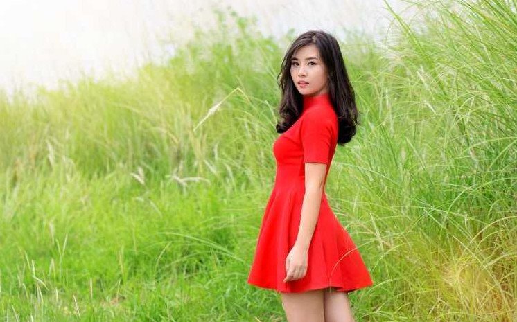 Азиатка в Красном прекрасное платье.