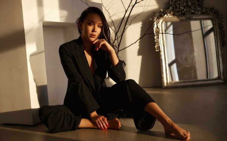 Симпатичная девушка в пиджаке и белье.