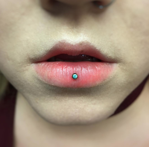 Пирсинг лабрет нижней губы.