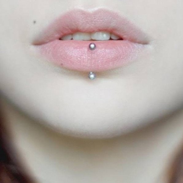 Вертикальный лабрет пирсинг нижней губы.